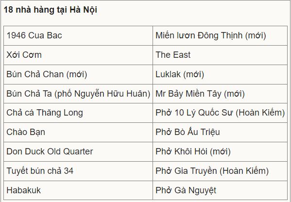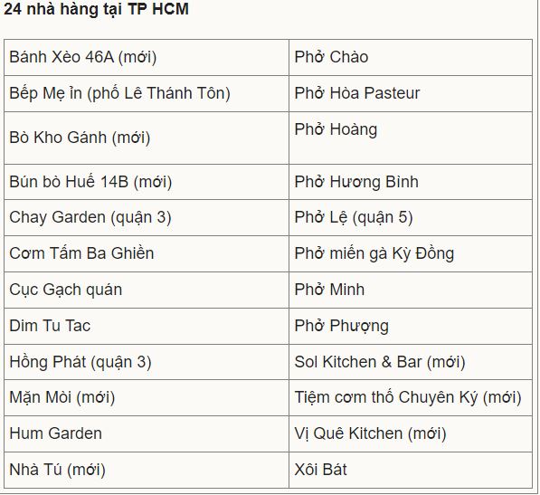 Tại Hà Nội, 5 nhà hàng mới xuất hiện trong danh sách gồm Bún Chả Chan, Luk Lak, Miến Lương Đông Thịnh, Mr Bảy Miền Tây. Trong khi đó, TP HCM có 8 nhà hàng lần đầu được vinh danh gồm Bánh Xèo 46A, Bò Kho Gánh, Bún Bò Huế 14B, Mặn Mòi (TP Thủ Đức), Nhà Tú, Sol Kitchen & Bar, Tiệm Cơm Thố Chuyên Ký, và Vị Quê Kitchen.
