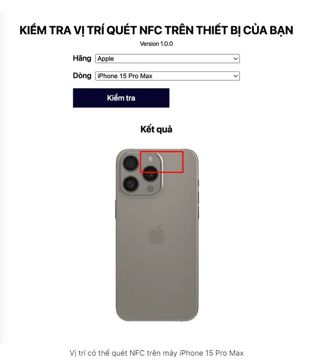 Nhấn Kiểm tra. Hệ thống sẽ mất khoảng 1 – 2 giây để tìm kiếm dữ liệu và hiển thị hình ảnh mặt lưng của sản phẩm. Trên hình sẽ có một khu vực hình chữ nhật viền đỏ khoanh vùng trên điện thoại. Đây là khu vực đặt đầu đọc NFC và người dùng có thể đưa phần có chip trên thẻ CCCD vào khu vực này để bắt đầu quá trình đọc.
