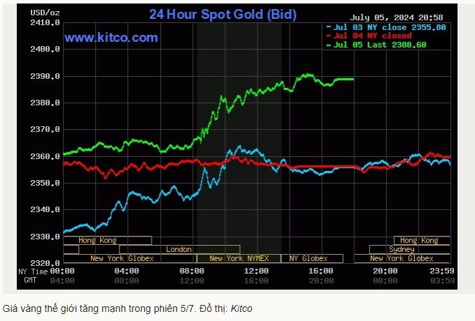 Trong phiên giao dịch ngày 5/7, giá vàng thế giới đã tăng mạnh, đạt mức cao nhất kể từ đầu tháng 6. Cụ thể, giá vàng giao ngay tăng gần 33 USD, chốt tại 2.388 USD mỗi ounce. Tính chung cả tuần, giá vàng đã tăng hơn 2%. Sự gia tăng này chủ yếu do báo cáo việc làm tại Mỹ yếu đi, làm gia tăng kỳ vọng rằng Cục Dự trữ Liên bang Mỹ (Fed) sẽ giảm lãi suất vào tháng 9.