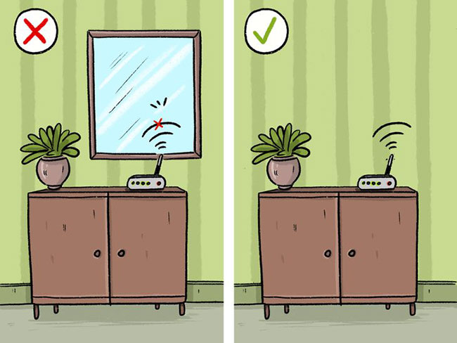 - Đặt router ở nơi ít bị gương và kính che chắn, hoặc sử dụng các bộ mở rộng sóng Wi-Fi để đảm bảo tín hiệu mạnh ở các khu vực có nhiều gương và kính.