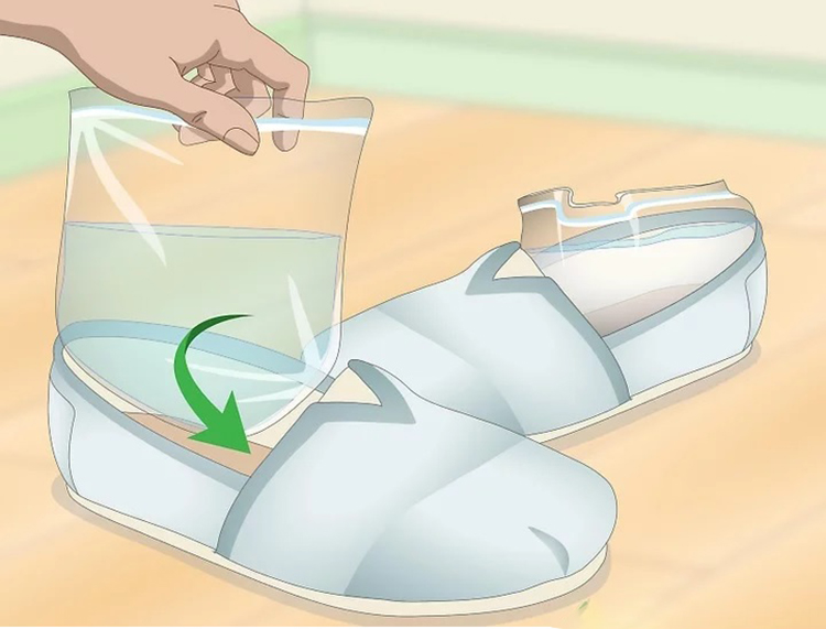 Sử dụng túi zip, đổ nước vào rồi nhét vào giày. Đặt giày trong ngăn đá qua đêm để nước chuyển thành đá và giúp giày giãn ra.