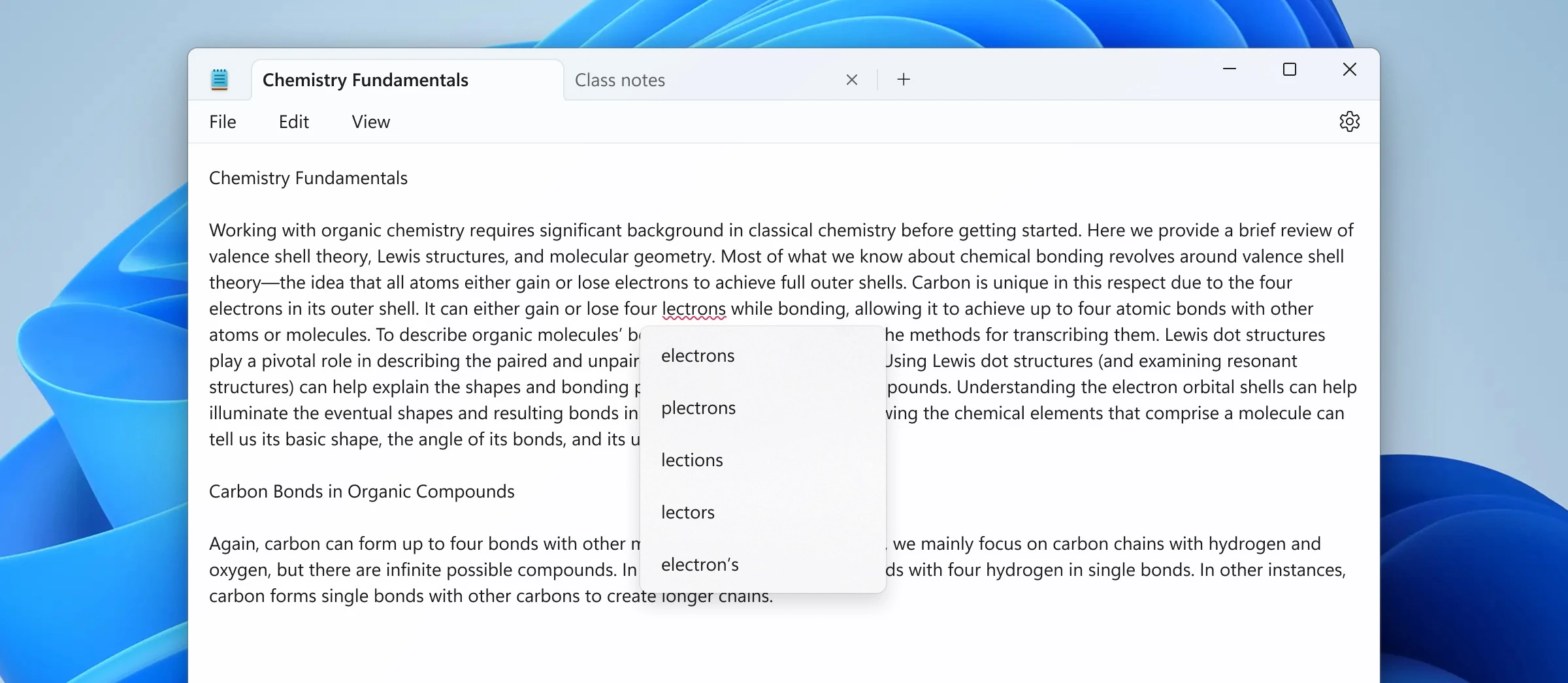 Notepad ban đầu được Microsoft giới thiệu là một phiên bản rút gọn của Word, nhưng tính năng kiểm tra chính tả chỉ được tích hợp từ năm 1985 trên Word. Người dùng có thể dễ dàng bật hoặc tắt tính năng này qua menu cài đặt của Notepad trên Windows 11.
