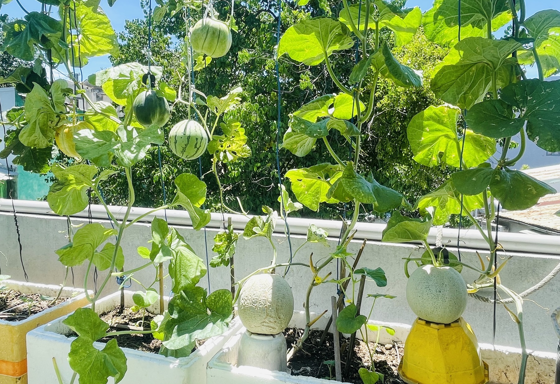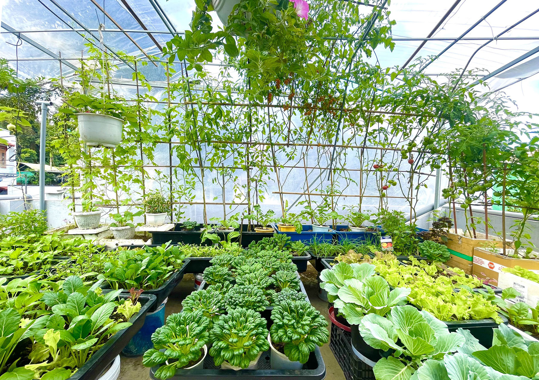 Các loại rau trồng trên vườn sân thượng của anh gồm có cà chua, dưa hấu, khổ qua, cùng các loại rau ăn lá và gia vị như cải, mùng tơi, ngót. Anh chăm sóc cây bằng cách tưới nước thường xuyên vào buổi sáng và chiều tối, đảm bảo rằng cây luôn được cung cấp đủ nước và dinh dưỡng.